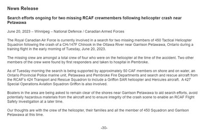 World News Canada Air Force Helicopter Crashes Into River Rescuers Search For Two Missing